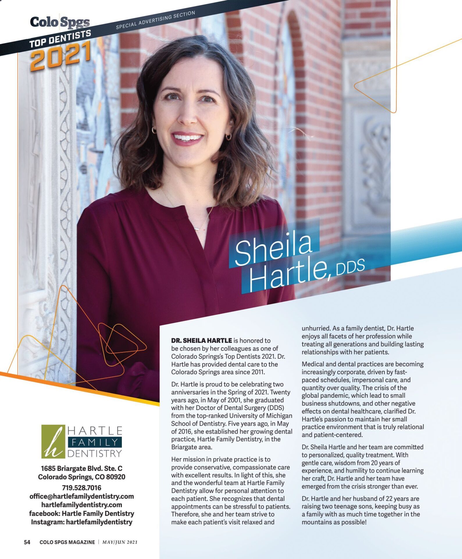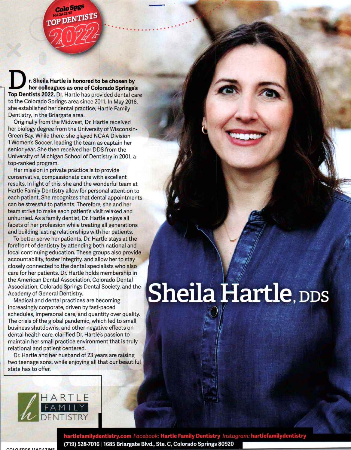Dr. Hartle is committed to staying at the forefront of dental education. She regularly attends lectures and is a member of several prestigious study clubs. These study clubs are composed of both general dentist small business owners like herself and a collective group of specialists from each facet of dentistry in the Springs. These selective groups provide pertinent dental education, community, and accountability in the dental field.
